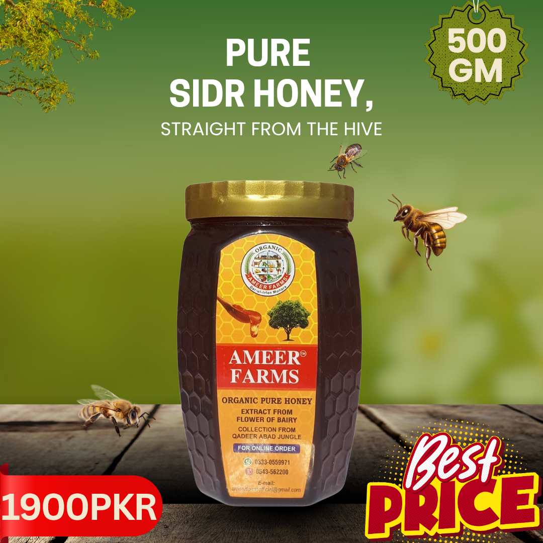 Our 500 GM Sidr Honey is a pure and natural honey harvested from the flowers of the Sidr tree. Known for its rich taste and multiple health benefits, Sidr honey helps in boosting immunity, improving digestion, and providing an excellent source of natural energy. It is also packed with antioxidants that fight free radicals and promote overall well-being. Enjoy it as a natural sweetener in teas, desserts, or even by the spoonful for a daily health boost.